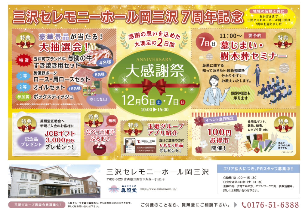 このたび、三沢セレモニーホール岡三沢7周年記念として大感謝祭を2025年12月6日(土)・7日(日)両日、10:00~15:00で開催致します。イベント当日は豪華景品が当たる大抽選会に参加できます。ぜひお誘い合わせのうえ、お気軽にご参加ください!