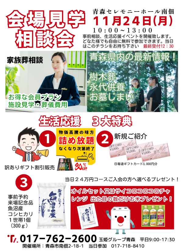 このたび、将来の不安を解消するための施設見学、相談会を開催することになりました。普段は見ることのできない施設の特徴や最新の設備]を直接ご覧いただける貴重な機会です。また当日ご入会された方は「魚沼産コシヒカリが必ず当たる」「サイコロコロコロチャレンジ」に参加できます。皆様のご参加を心よりお待ちしております。